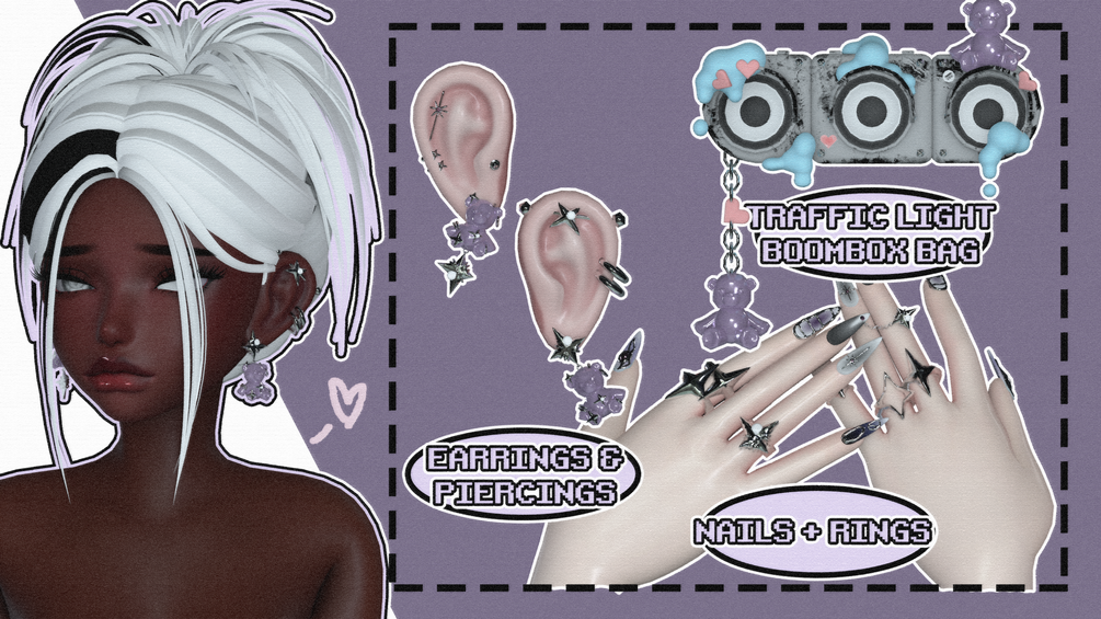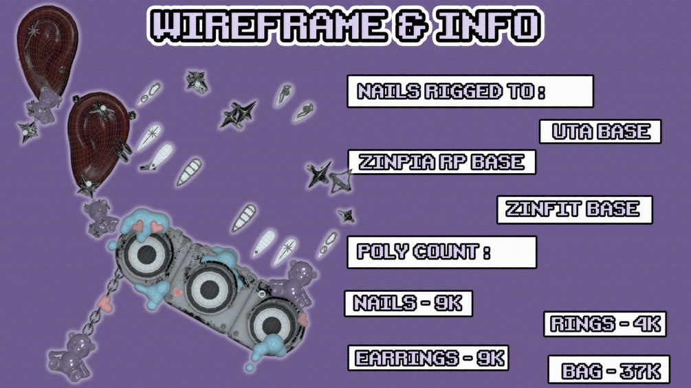 traffic light boombox "backbling" bag (37k polys ) , bear earrings + piercings ( 9k polys ) , custom made nails ( 9k polys ) + rings ( 4k polys ) which are uv mapped and textured